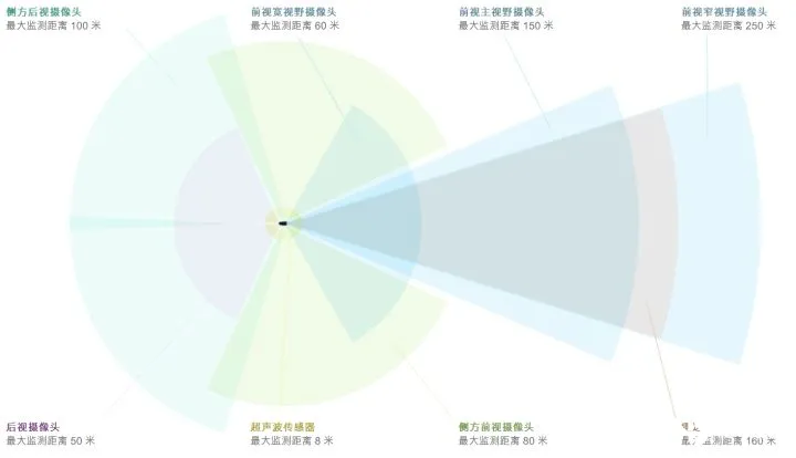 如下图,可以看出三个摄像头的感知范围由远及近,分别为前视窄视野摄像头(最远感知 250 米)、前视主视野摄像头(最远感知 150 米)及前视宽视野摄像头(最远感知 60 米)。