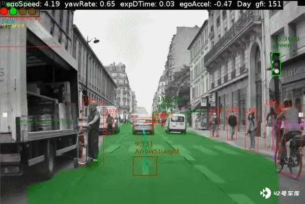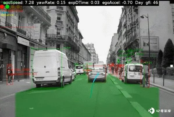 图中使用绿色或红色矩形框框出的物体。这些感知信息更多的是作为道路特征与高精度地图做匹配后,辅助定位。当然也可以基于这些感知结果进行地图的更新。