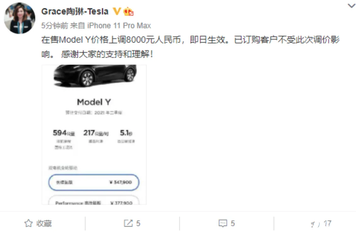 今日,特斯拉副总裁陶琳在微博宣布,Model Y 价格上调 8000 元人民币,即日生效,已订购客户不受此次调价影响。