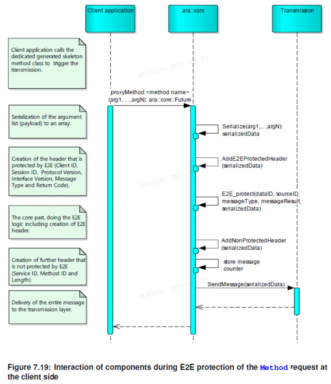 AUTOSAR 架构中客户端(Client)侧在执行 E2E(End-to-End)保护的 Method 请求时,各组件之间的交互流程图