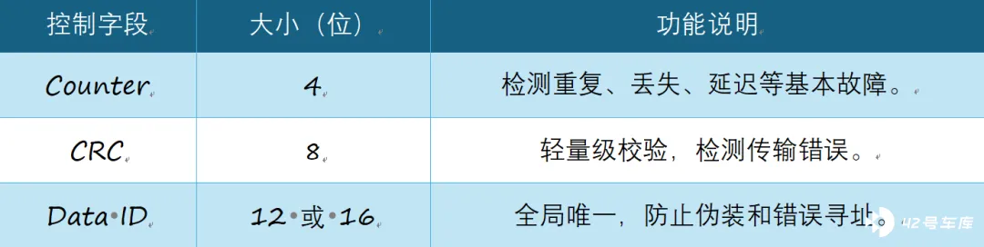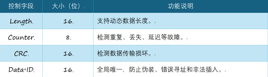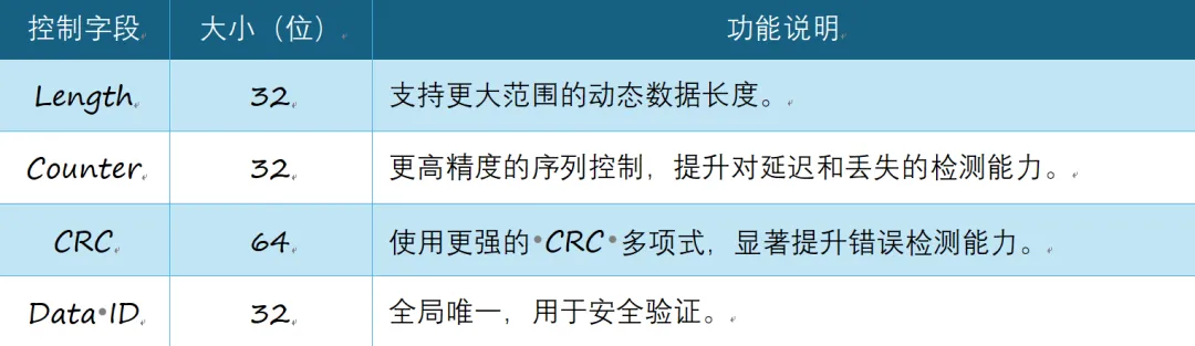 注意:Data ID 不包含在 E2E 头部中,通常由通信上下文隐式确定。适用于资源受限、数据长度固定的场景。