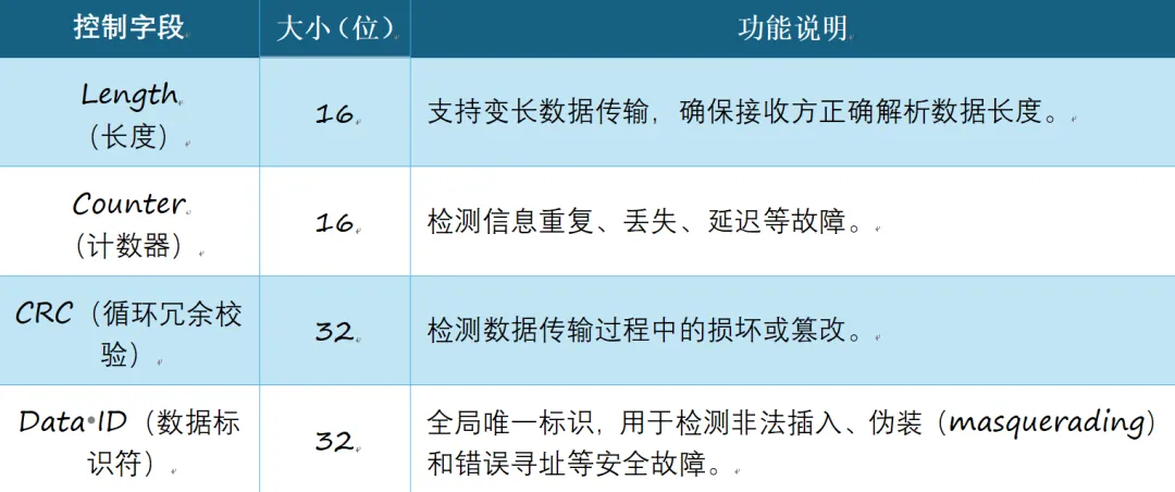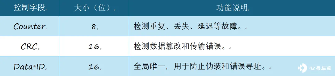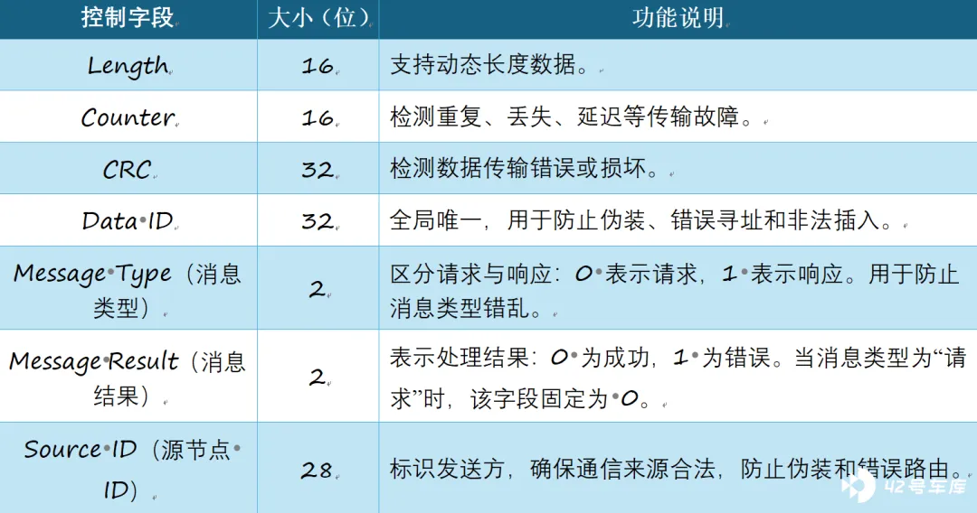 E2E 保护的核心价值的就是弥补这一短板:发送端给数据附加 「保护头」(含 CRC 校验值、计数器、Data ID 等关键信息),接收端通过验证 「保护头」 自主判断数据是否被篡改、丢失或重复。哪怕底层网络出问题,也能及时拦截异常数据,避免安全风险。