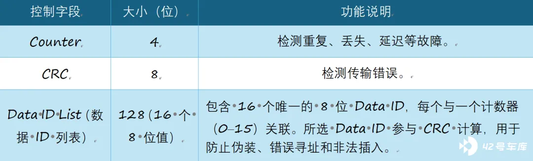E2E 头部仅 16 位(其中 4 位保留未用),Data ID 列表不包含在头部中,需在配置中预先定义。