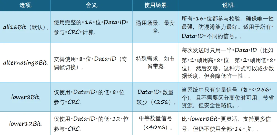 这些 E2E 配置文件可根据具体通信需求灵活选用,确保在多样化的应用场景中实现可靠、安全且具备强健错误检测能力的端到端数据传输。开发者可根据对数据完整性、检测精度和系统资源的权衡,自定义 Data ID 和 CRC 校验字段的长度,范围通常从 8 位扩展至 64 位甚至更高。然而,更长的校验字段虽能显著提升错误检测能力,也会相应增加数据开销并提高对芯片处理性能的要求,因此需在系统安全性和计算资源之间进行综合优化。