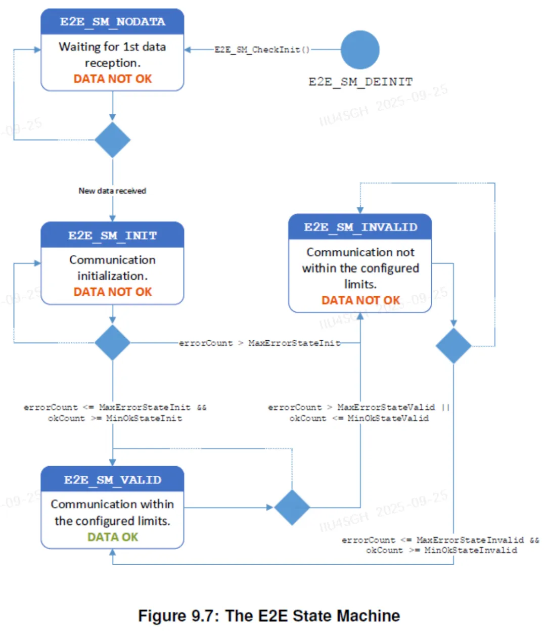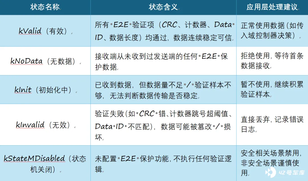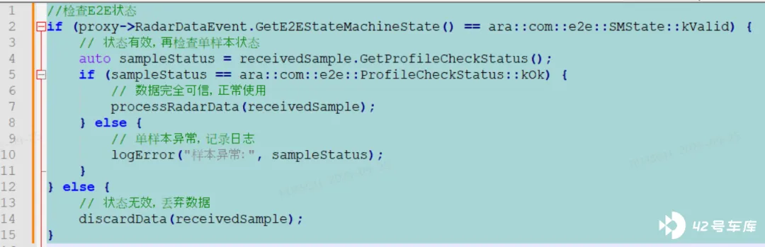 接收端通过调用 AUTOSAR 提供的 API,判断数据状态机和单样本验证结果,即可决定是否使用数据 —— 状态有效且样本验证通过,就正常处理;否则记录日志或直接丢弃。