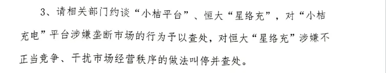 投诉信除了对有关部门提出的政策诉求外,篇幅较大的内容是关于滴滴旗下 「小桔充电」 平台涉嫌垄断市场行为,以及恒大旗下的 「星络充电」 涉嫌不正当竞争,干扰市场经营秩序。
