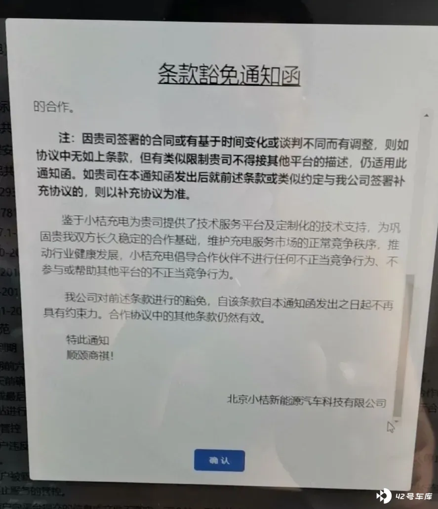 在临近发稿前,田华提供了小桔充电最新的解决方案,名为 「条款豁免通知函」,对存在上述第 2.5 条或类似的条款限制进行豁免,并且该通知函直接出现在小桔充电为运营商提供的充电管理后台进入界面中,运营商必须点击确认才能进入后台查看场站状态、订单数据、营业流水等信息,而这些操作是运营商们日常工作之一。