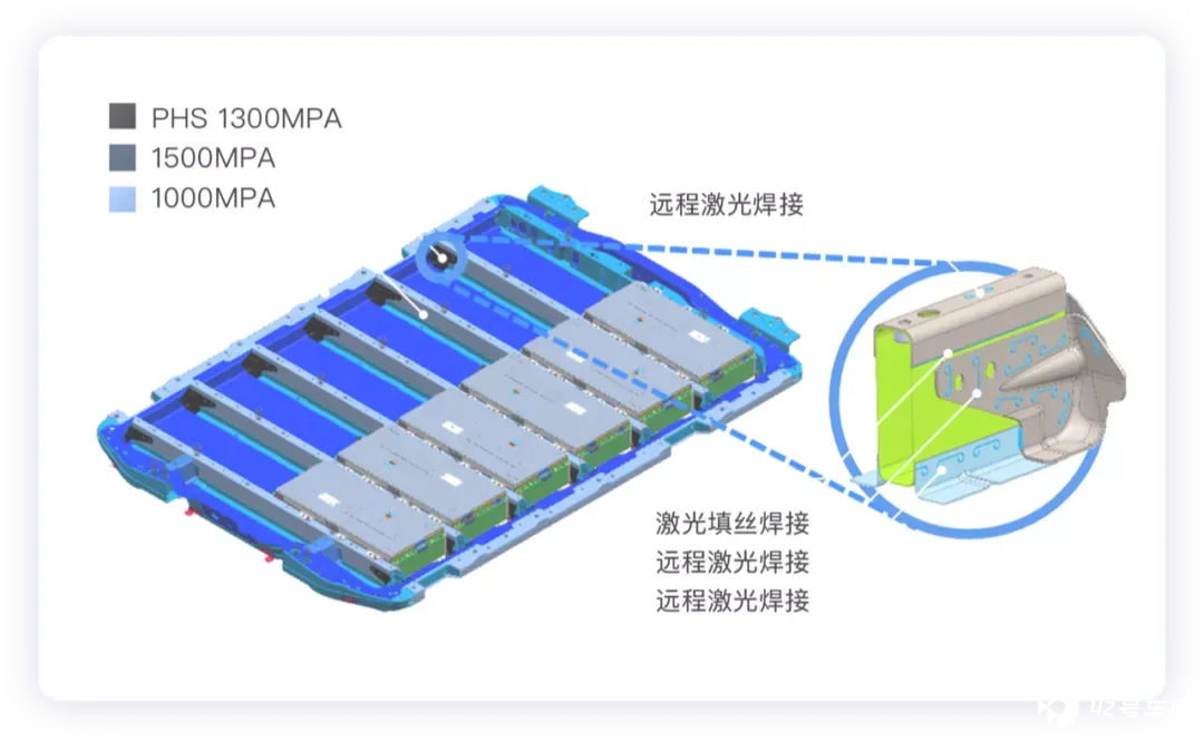 ● 这个电池包估计是最耐撞的了,电池包里面采用多根 1500MPA 超高强度钢横梁进行加固(12 模组是 5 根横梁,10 模组 4 根,8 模组 3 根)。