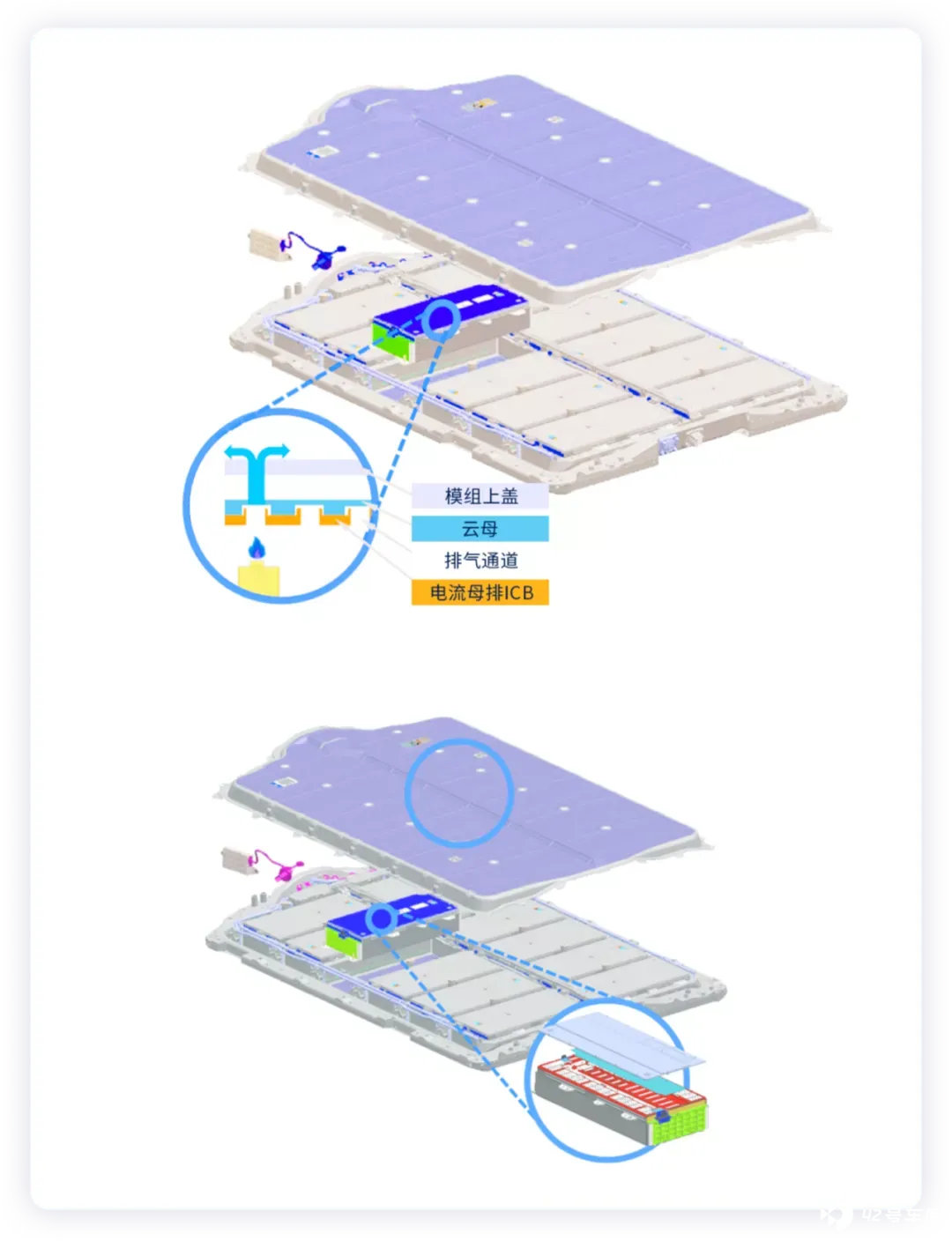 2)电芯泄压阀的上方都用了云母片进行阻隔,这样电池模组的上盖还是塑料的;