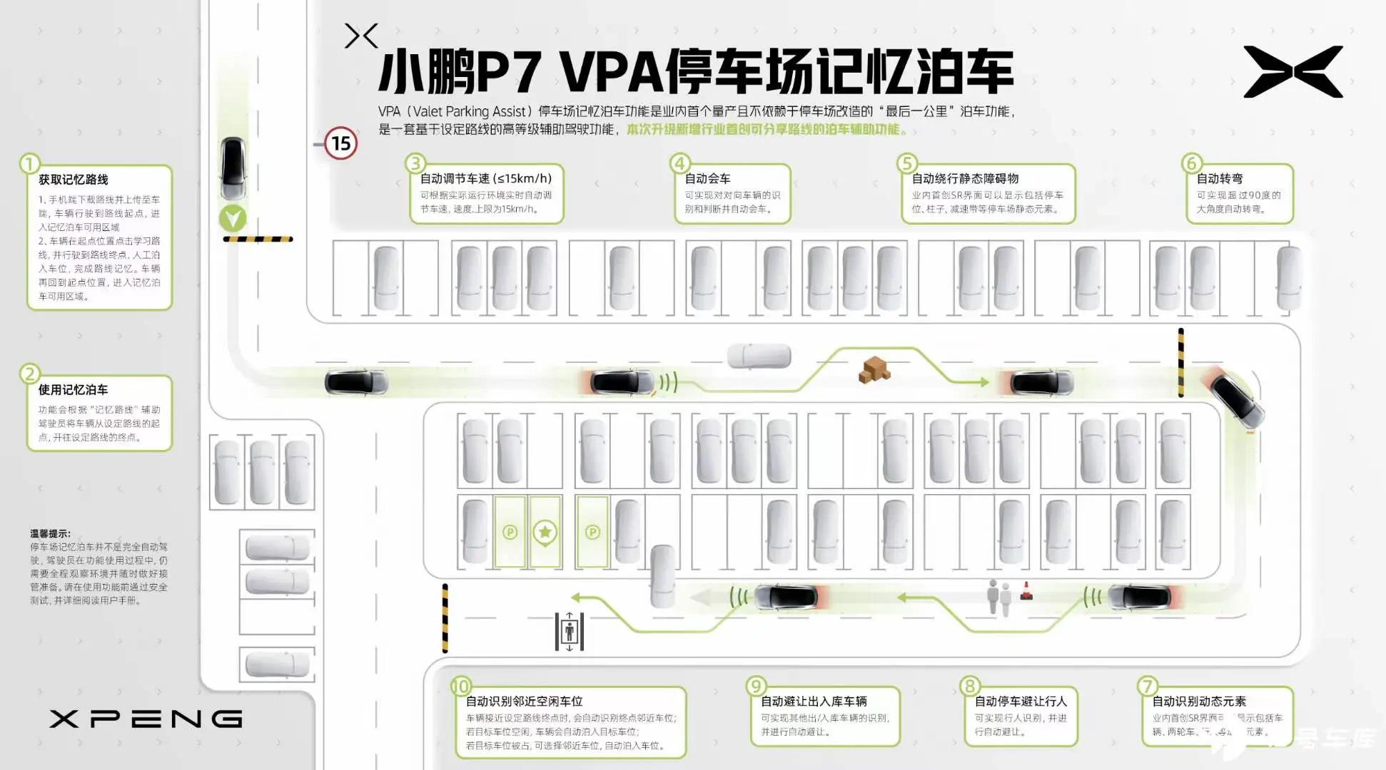 新版本的 VPA 自动泊车新增了路线图分享功能,成为业内首个可分享路线的泊车辅助功能。路线图分享功能最大的使用场景是商超和地下停车场的超充站点。用户可在获取其他人分享路线的基础上,在这些高频场景快速、高效的抵达电梯口附近或超充站点停车位置。
