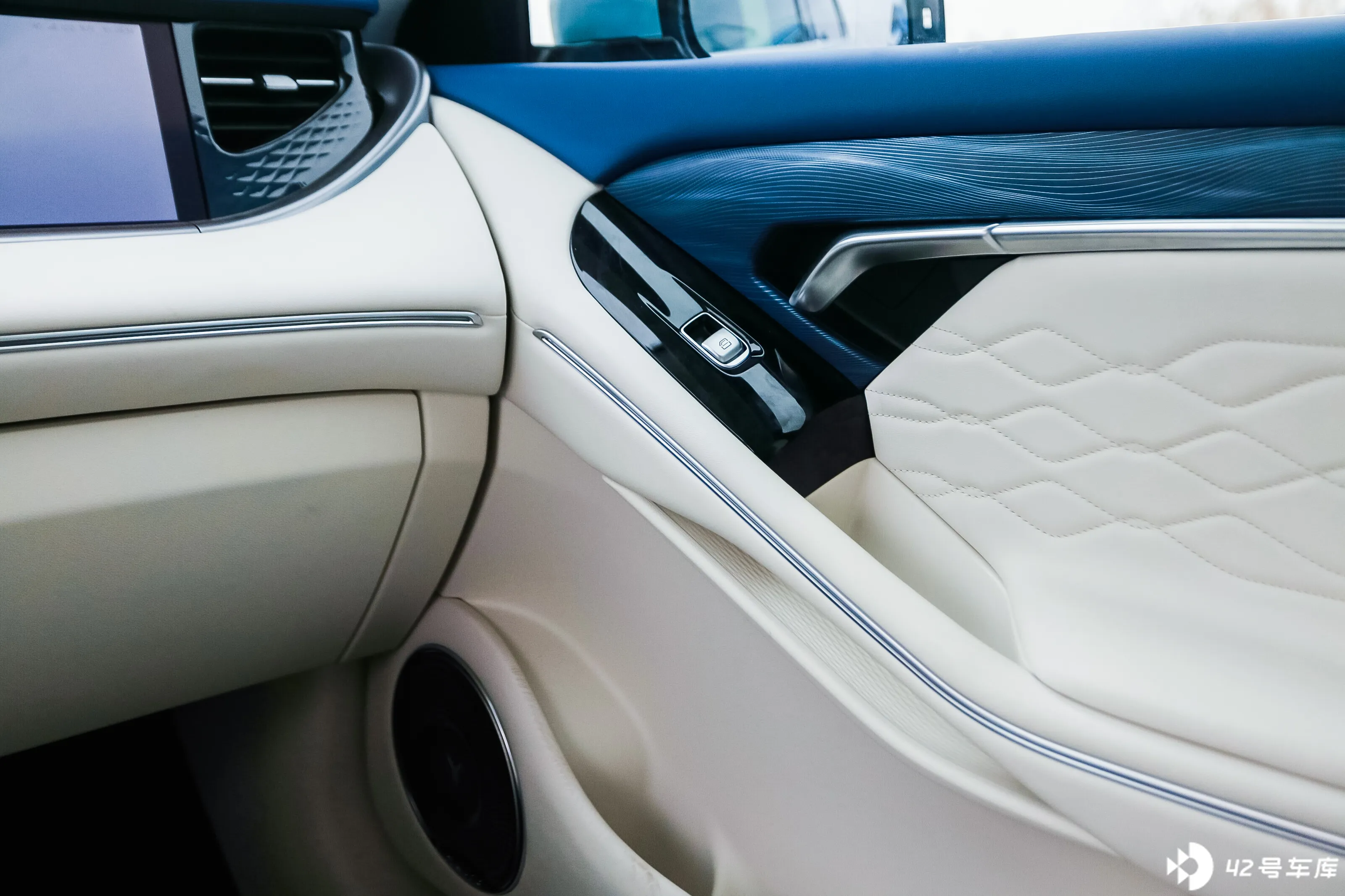 停下手中的岚图 FREE,视线重新回归车内。香氛系统散发的淡雅香气以及蓝白搭配的细腻真皮所营造出的温馨氛围让我有了疑问:岚图 FREE 是兼顾运动和豪华的全能型选手,还是徒有豪华内饰的运动偏科生?
