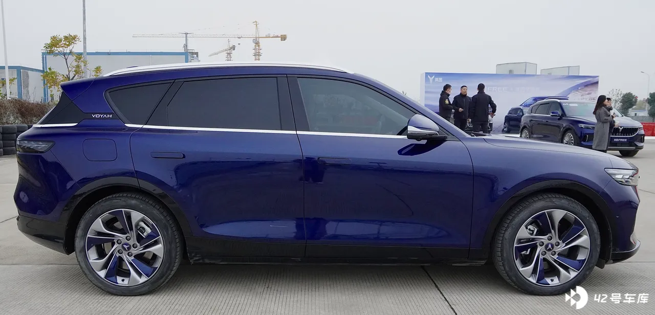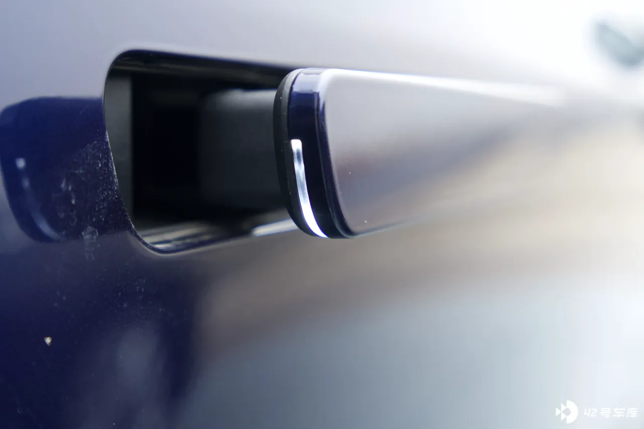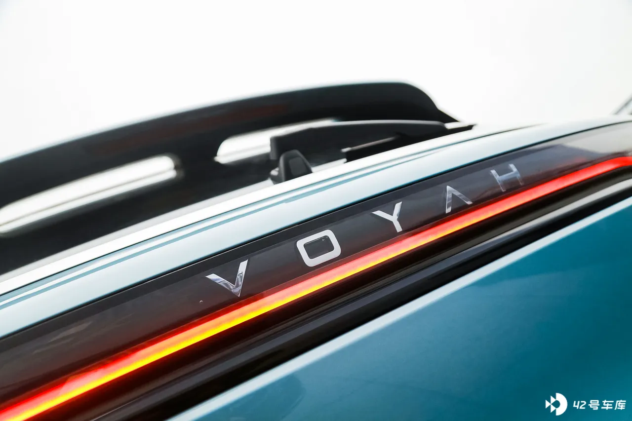 车身侧面简洁但不缺细节点缀:后视镜旁设计有导流槽,减小风噪;解锁车辆后隐藏式门把手缓缓推出,把手上的白色指示灯随之亮起,仪式感十足;同时车身 C 柱上岚图品牌的英文「VOYAN」标识印在延伸到车尾的黑色饰板之上,让粗壮的 C 柱显得不单调。