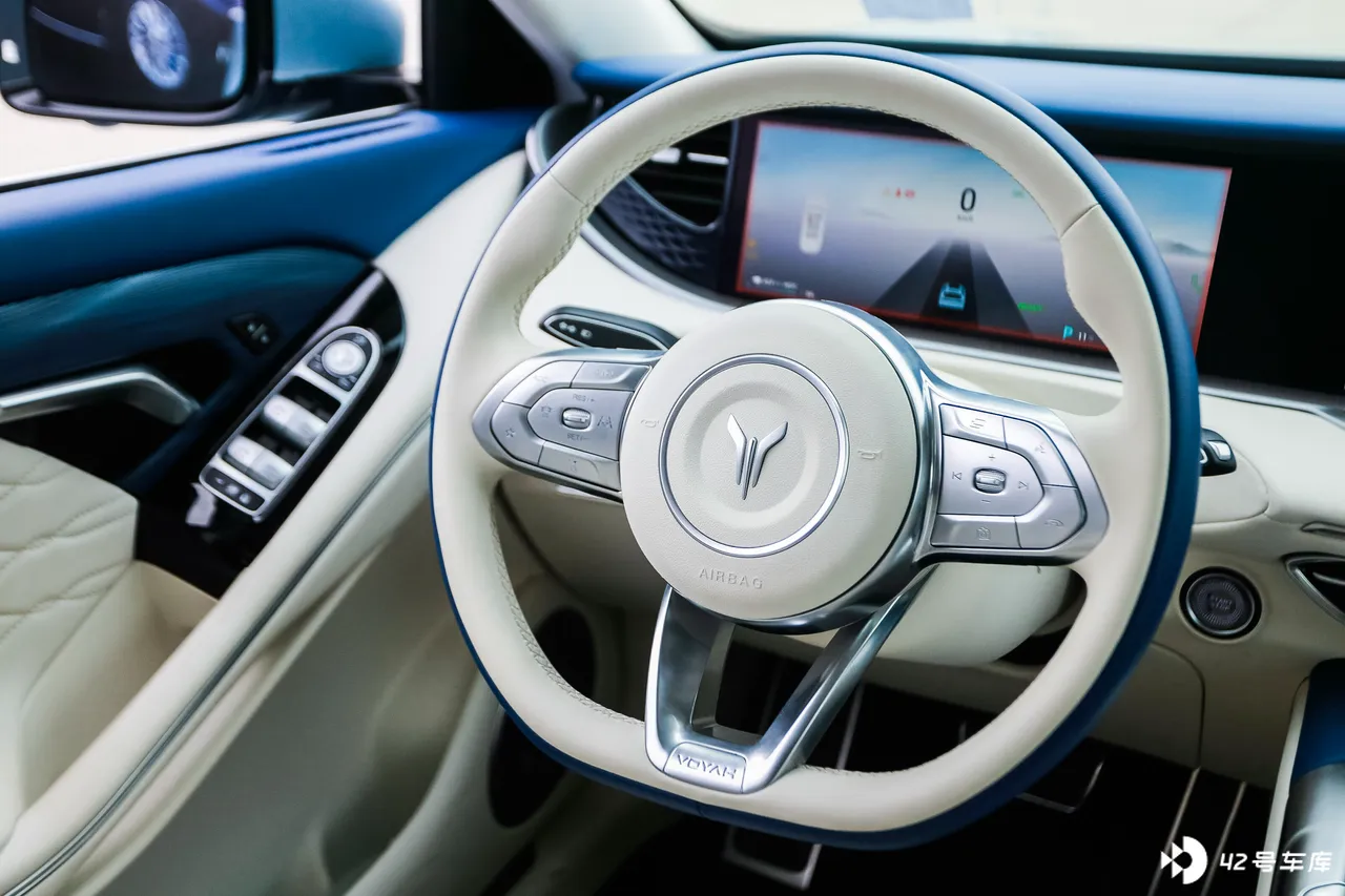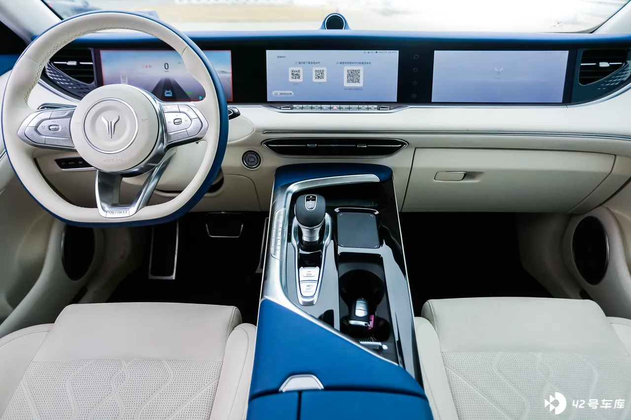 坐进驾驶室,蓝白真皮的搭配再次让我的脑海浮现出「游艇」一词。岚图 FREE 的内饰和外观非常统一,将稳重成熟的豪华设计理念贯穿到底。