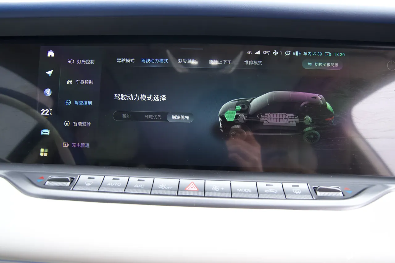 需要提出批评的两个点是,通过按键选择驾驶模式的过程中,在中控车机上不能同时通过滑动来选择,这一点违反操作直觉;另外,在行驶过程中调节驾驶模式,仪表盘会对应进行升降。在此过程中,仪表盘会有 1—2 秒的黑屏,此时只显示岚图 logo,这个问题可能会对行驶安全造成威胁。