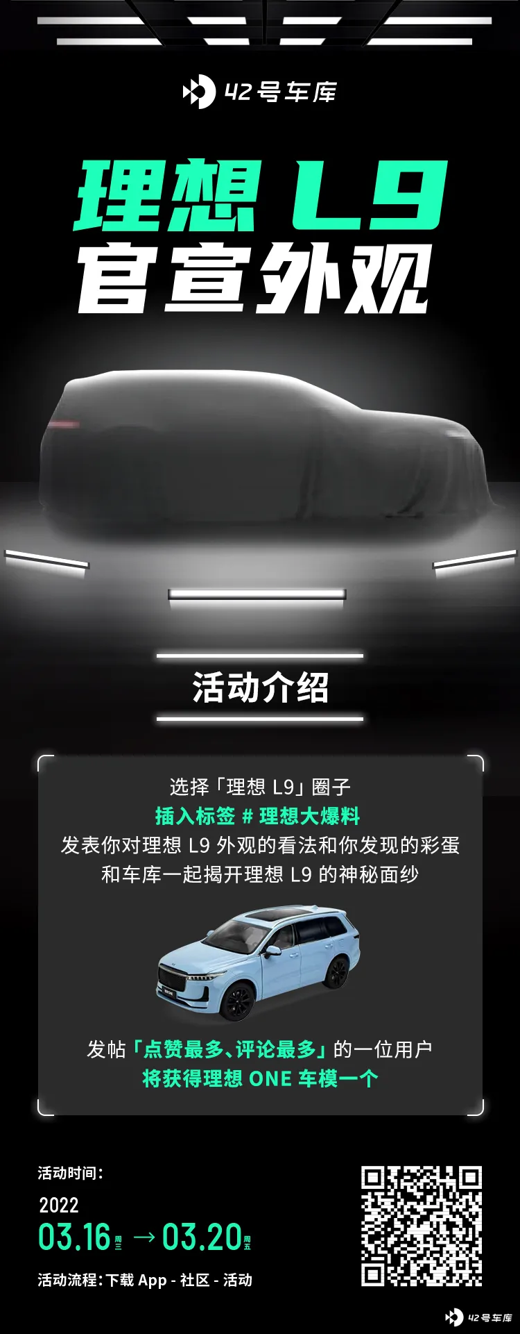 线上发帖参与,点击「立即参与」,发表你对理想 L9 外观的看法晚上的爆料内容猜测!和车库一起揭开理想 L9 的神秘面纱。