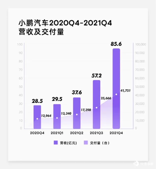 2022 年 3 月 28 日,小鹏汽车发布了 2021Q4 财报以及 2021 年年报。尽管车载芯片供应紧缺和电池原材料上涨给小鹏 2021 年的交付和营收产生了一定压力,但小鹏还是实现了交付及营收同比翻两倍、基本锁定新势力 2022 年第一季度交付冠军的成绩。