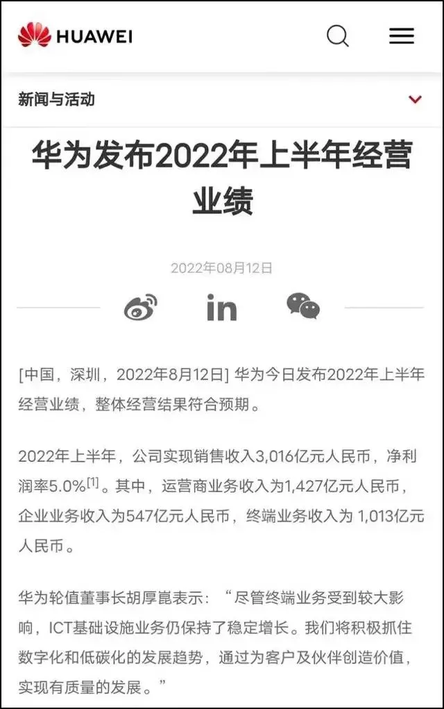 8 月 12 日,华为发布了 2022 年半年报,对于华为这样万亿级营收体量的公司而言,难有大起大落,华为的半年报并不出色,甚至多有隐忧。其实不仅华为这样,今年上半年,国内的大集团都不出色,大家心目中的领头羊腾讯控股,上半年的净利润更是腰斩了 56%。