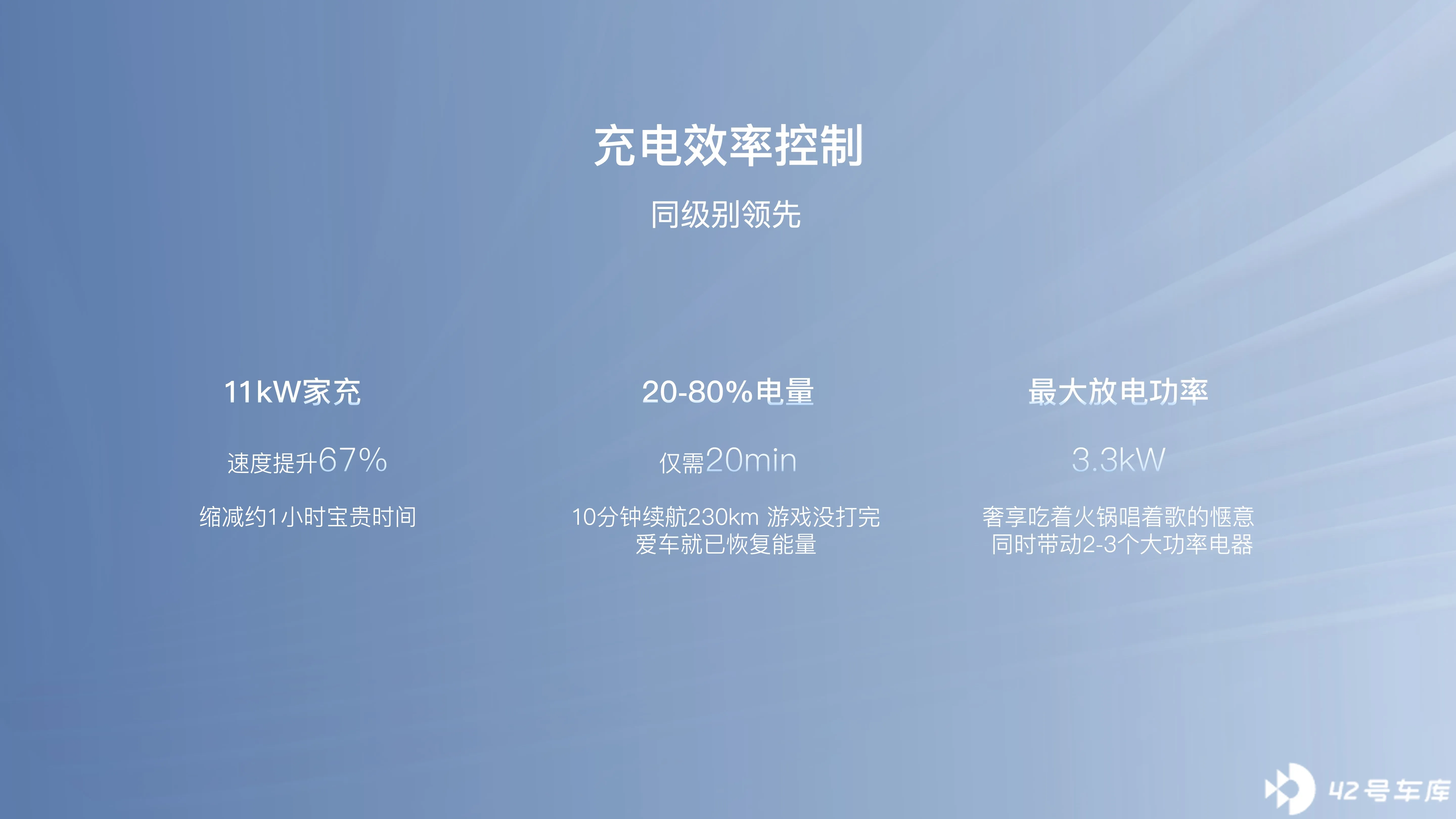 在充电功率上,家充可支持 11 kW 三相电,最大外放电功率为 3.3 kW。