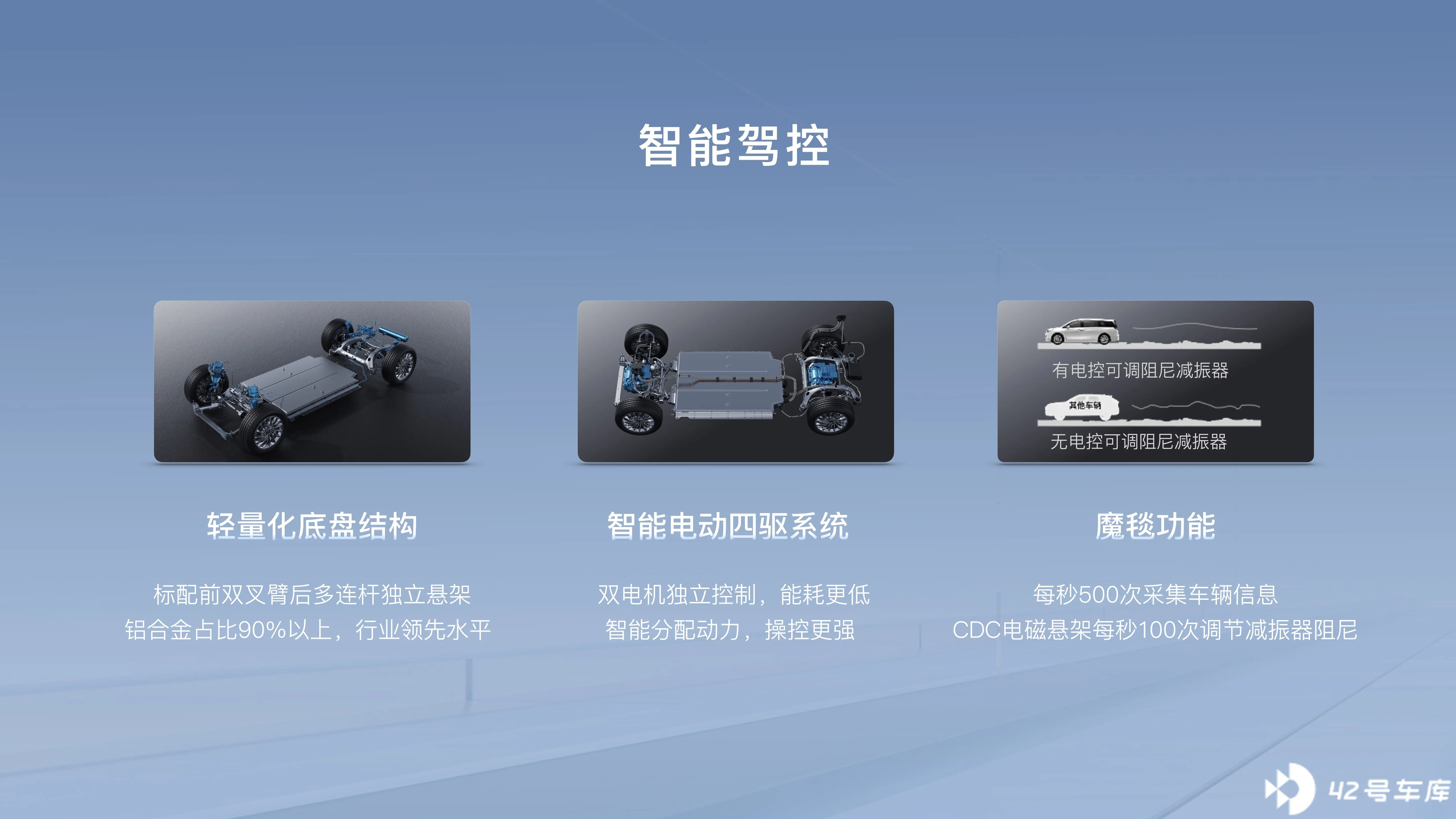 底盘方面,搭载前双叉臂 + 后五连杆,铝合金占比超过 90%。悬挂配置为空气悬挂 + CDC 可变阻尼悬挂。