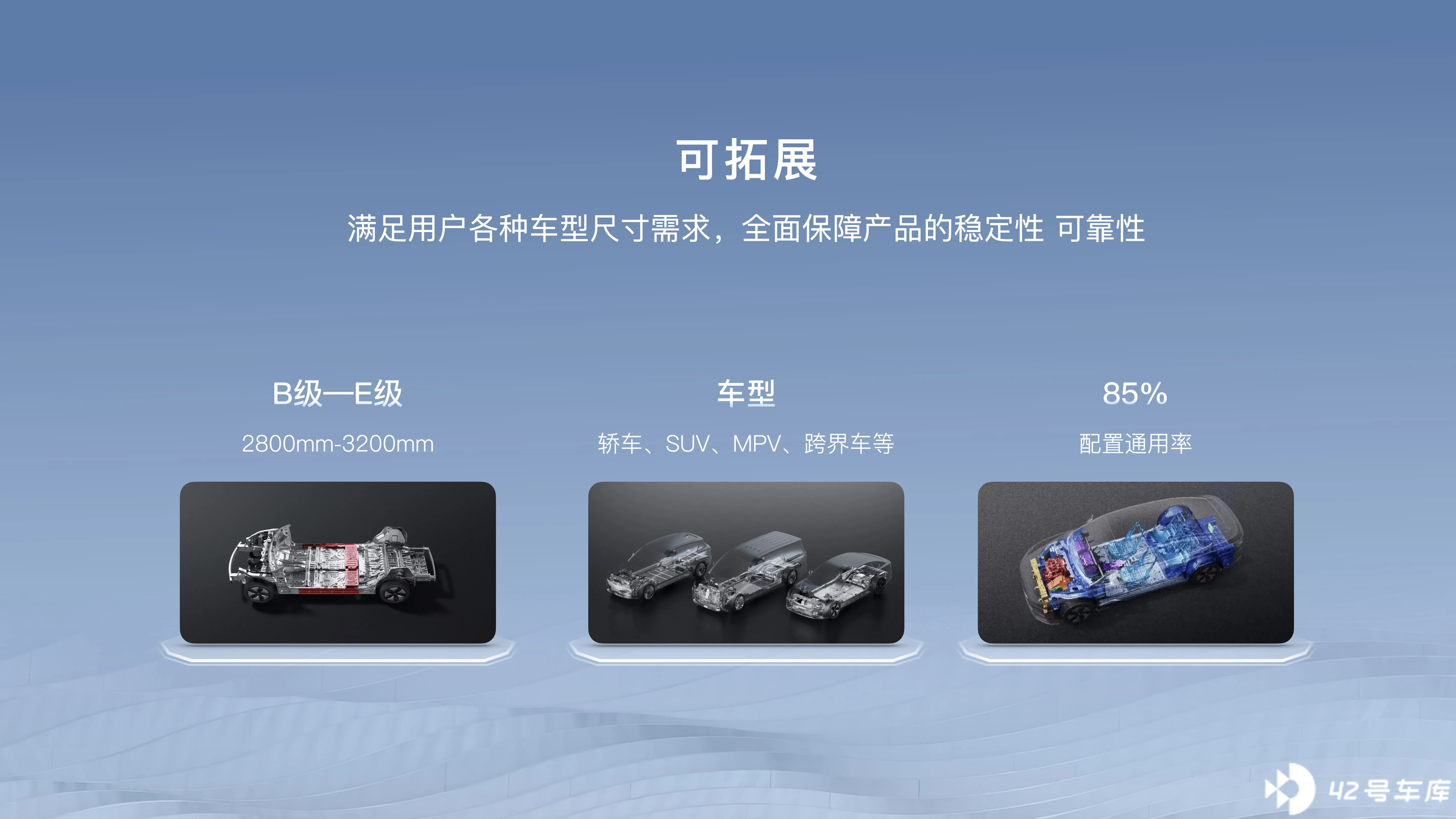 最后说一下可拓展。ESSA 可支持 2,800——3,200 mm 轴距的车型,可支持从 B 级车到 E 级车的全覆盖。