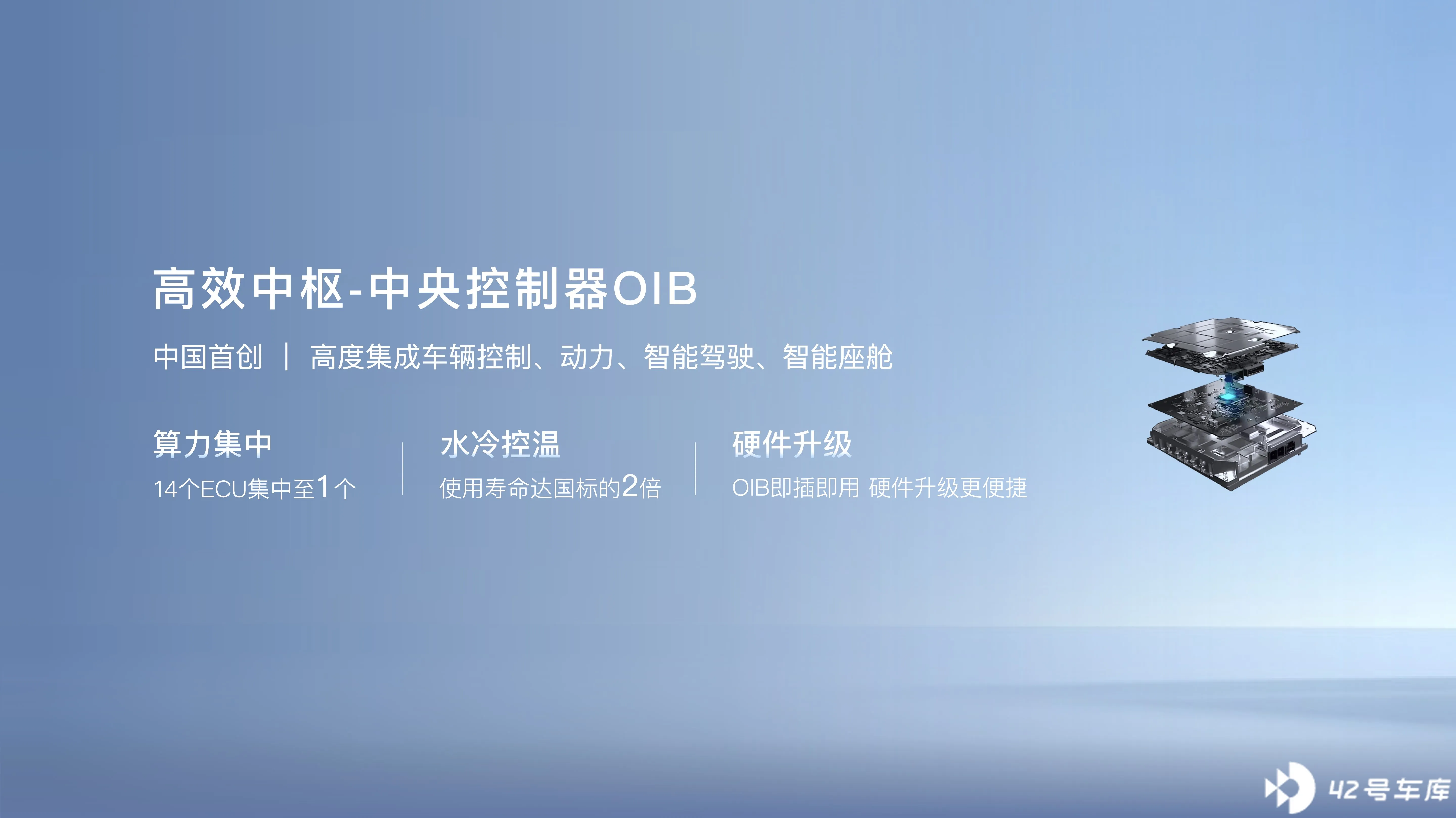 首先,中央控制器 OIB 将车辆控制、动力、智能驾驶、智能座舱四大控制器集成在了一起,未来能更便利的升级。