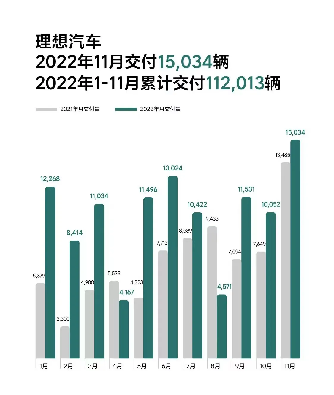 11 月,理想的月交付量同比增长11.5%。截止到 2022 年 11 月 30 日,理想汽车累计交付量为236,101辆。