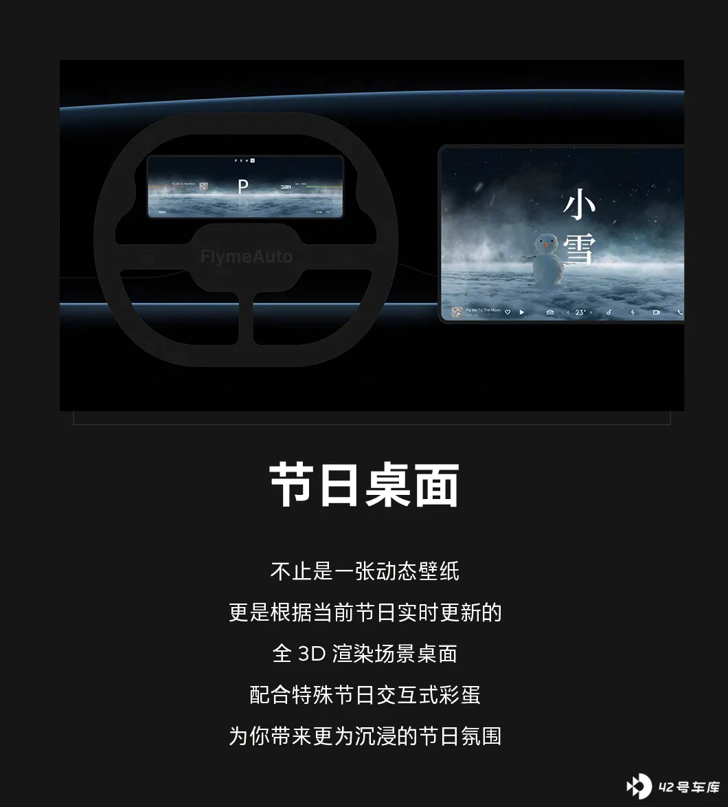 而 FlymeAuto 作为智能手机系统的老朋友,利用过去的手机系统经验来做车机系统本身就很值得期待,而且这套系统从目前整个产品的特性和美观度上看,都与现有的车机产品有所区别。个人觉得配合节日氛围实时更新的 3D 节日桌面和应用流转功能还是能在视觉和体验上带来比较不一样的效果的。