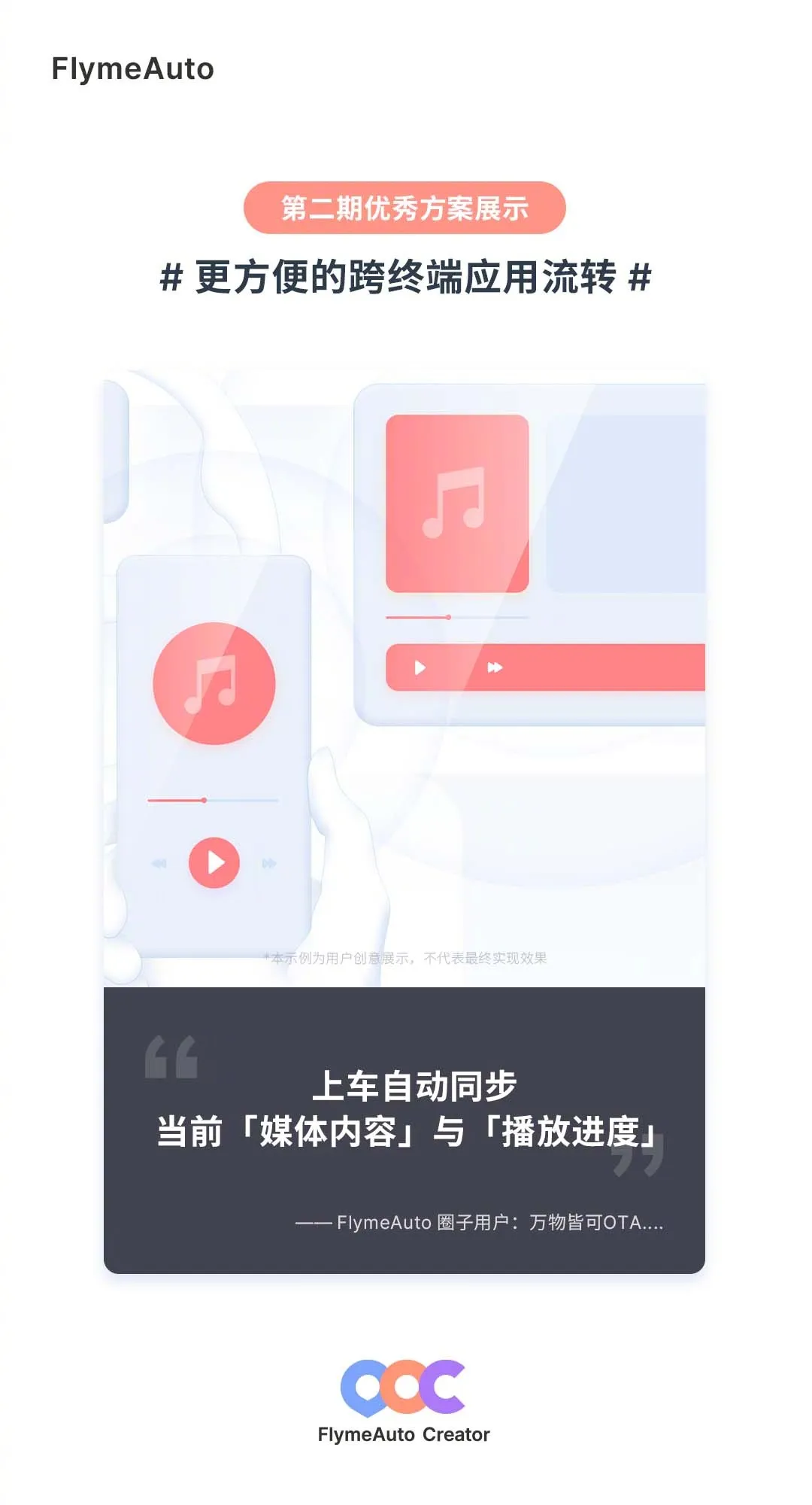 从视频中还可以看到,FlymeAuto 的菜单采用同屏多页面显示,并支持应用分屏功能,但是关键亮点还是类似多屏互动的应用流转功能。这个功能也在 2022 年 12 月初 FlymeAuto 主理人的方案征集活动上,部分优秀方案中有所展现。