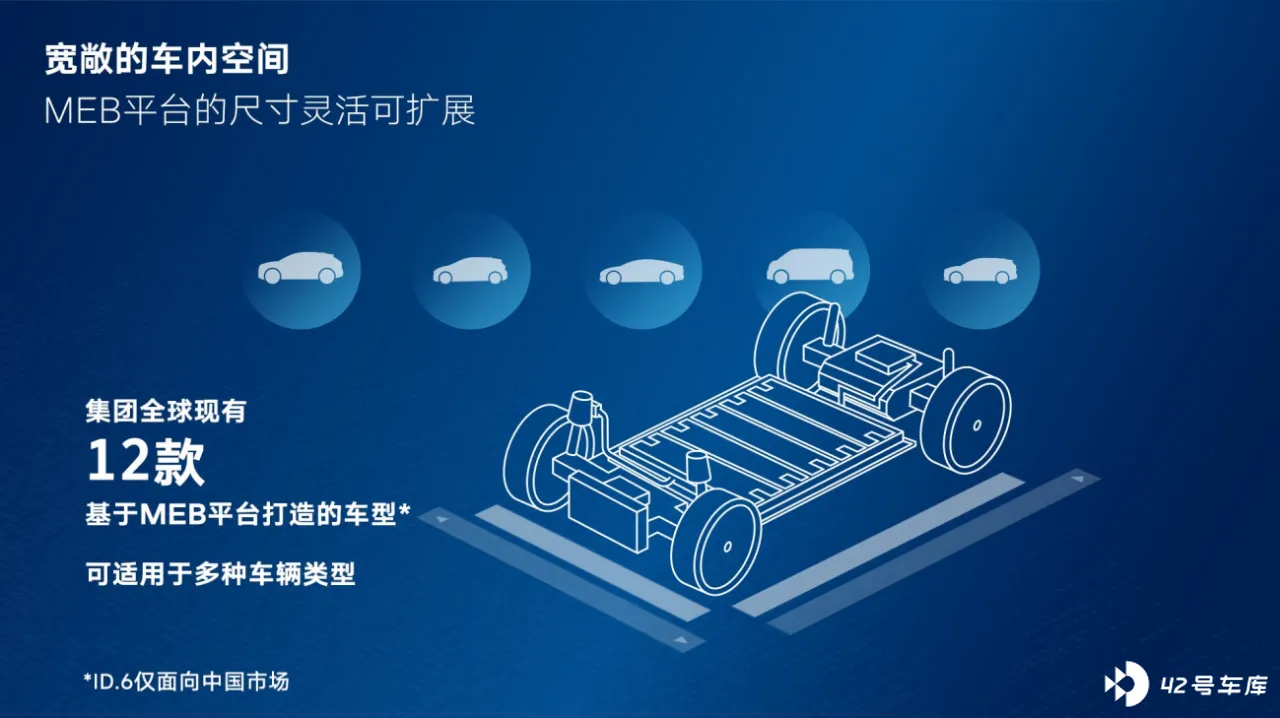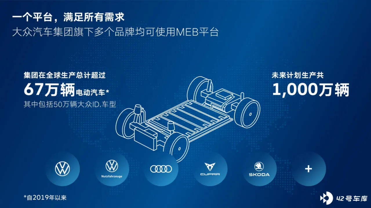 目标也分「画饼派」和「务实派」。支撑 MEB 千万级销量目标的是源自其自身的灵活可拓展性。模块化的概念使得轮距、轴距灵活可变,MEB 平台就像一块肥沃的土壤,从起步的紧凑级两厢车,到宽敞点的 SUV,以及更大尺寸的 MPV,各种车型自由生长。至于生长的果实,目前大众集团旗下已经有了 12 款 MEB 平台车型。