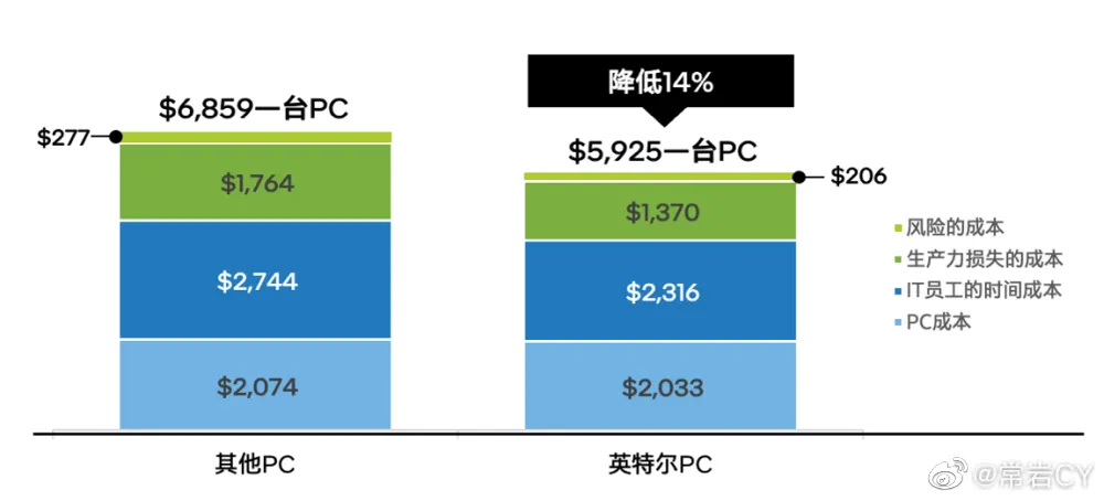 IDC 的数据显示,从 PC 成本到员工时间,再到生产力损失和潜在风险,采用 vPro 技术之后,可以让 PC 在 5 年的使用之中成本降低 14%。