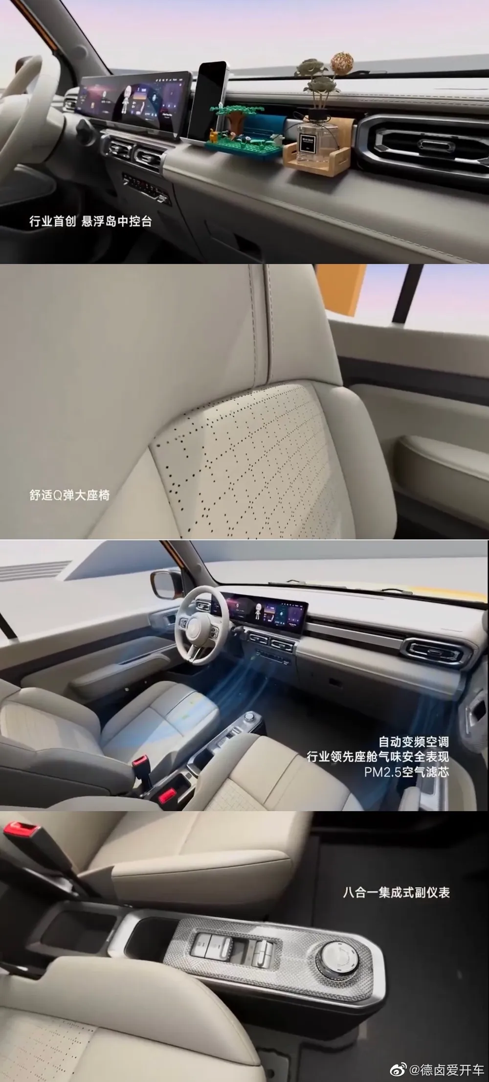 宝骏悦也 —— Joy Box 玩乐座舱篇, - 两种情绪内饰颜色: 自黑、独白, - 1.16㎡ 的大面积软包材质覆盖, - 游戏玩乐手柄式T型方向盘, - 10.25 英寸双联屏+ KiOS, - 行业首创悬岛式中控台, - 八合一集成式副仪表, - 舒适 Q 弹的大座椅, - 主、副驾座椅电调, - 后排一键电动进出, - 搭载自动变频空调, - 后排715L放倒空间, - 前舱配备储物空间, - 16 处魔方储物空间。