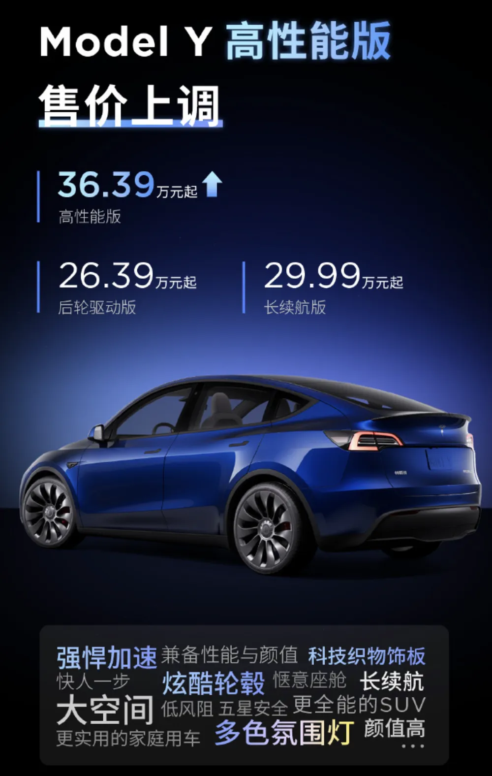特斯拉宣布从今天起 Model Y 高性能版售价上调 14,000 元,调整后的价格为 363,900 元。 后驱标准版和长续航版价格不变。