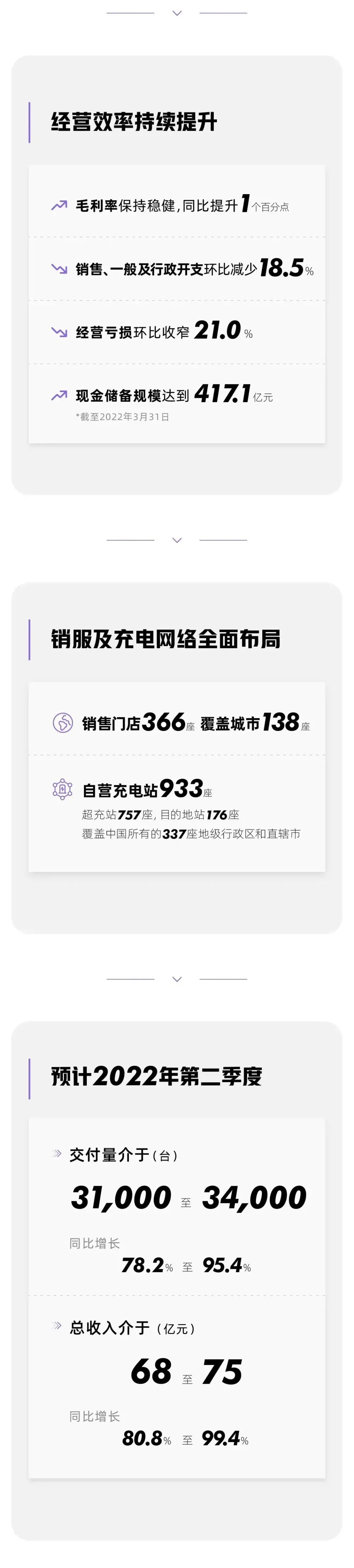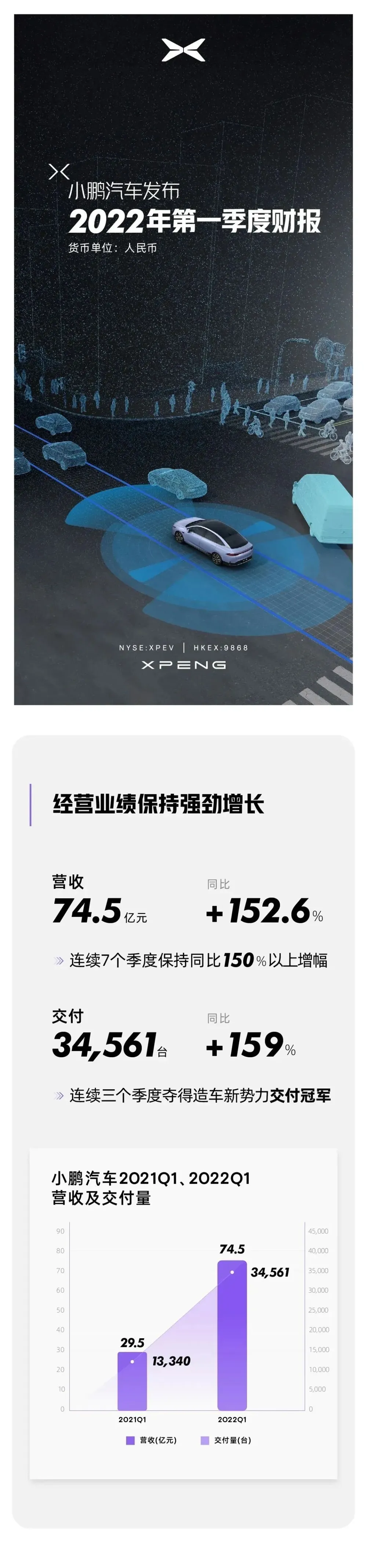小鹏汽车公布2022年Q1财报数据: • 2022年第一季度汽车总交付量为34,561辆,较2021年同期的13,340辆增长159%。 • 2022年第一季度P7交付量为19,427辆,较2021年同期的7,974辆增长144%。P7月交付量于2022年3月首次突破9,000辆。 • 2021年10月开始量产后,P5交付量保持稳步增长的势头,于2022年第一季度达到10,486辆,其中超过50%可支持XPILOT 3.0或XPILOT 3.5。 • 截至2022年3月31日,小鹏汽车销售网络持续扩张,包括366间门店,覆盖138个城市。 • 截至2022年3月31日,小鹏汽车自营充电站网络进一步扩展至933座,包括757 座小鹏汽车自营超级充电站及176座目的地充电站。 • 2022年第一季度总营收人民币74.5亿元(11.8亿美元),较2021年同期增长152.6%。 • 2022年第一季度汽车销售收入为人民币70.0亿元(11.0亿美元),较2021年同期增长149.0%。 • 2022年第一季度毛利率为12.2%,相较而言,2021年同期为11.2%,而2021年第四季度为12.0%。 • 2022年第一季度汽车利润率(即汽车销售毛利润占汽车销售收入的百分比)为10.4%,相较而言,2020年同期为10.1%。 • 截至2022年3月31日,现金及现金等价物、受限制现金、短期存款、短期投资及长期存款为人民币417.1亿元(65.8亿美元),相较而言,截至2021年12月31日为人民币435.4亿元。