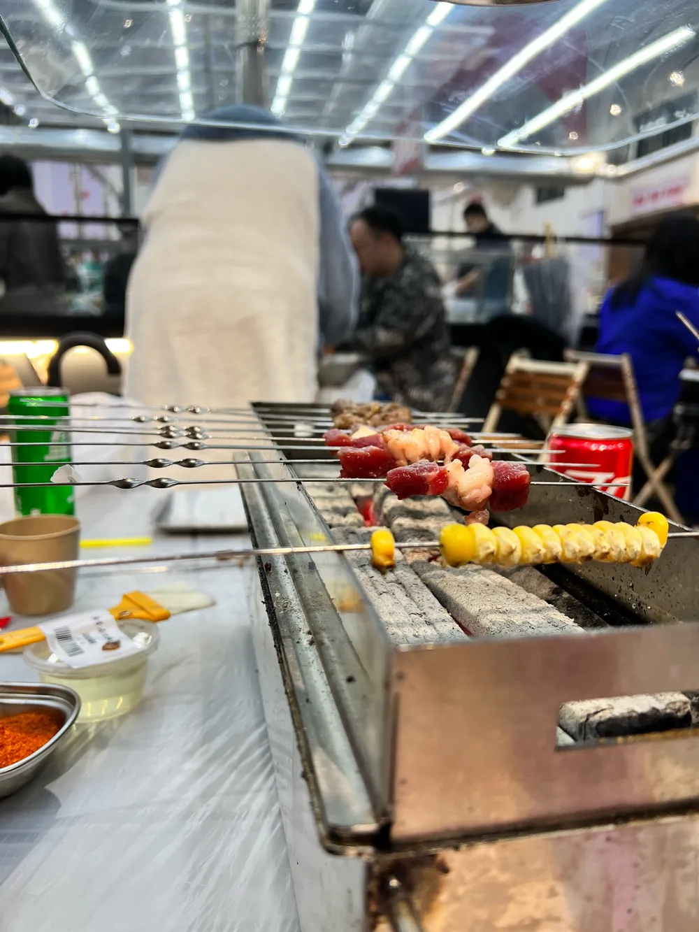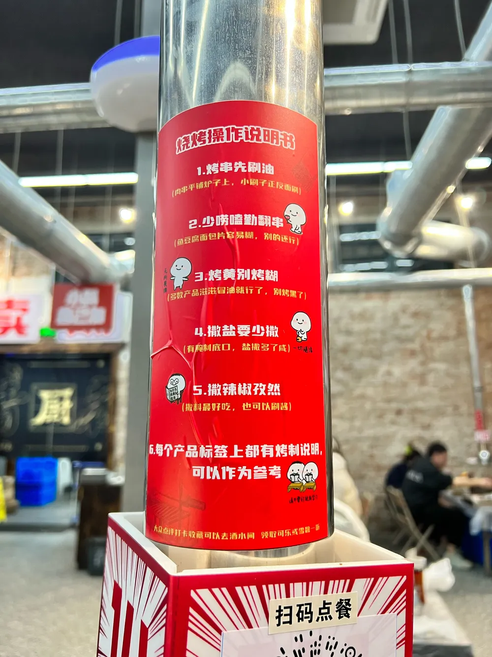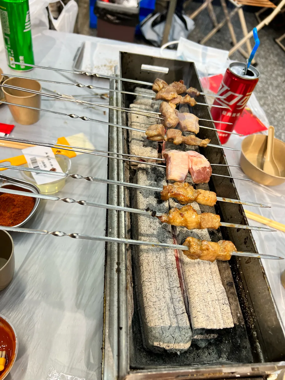 🍃环境: 地址很好找,直接导航就可以到达目的地,因为是厂房改造风格设计上还是不拘一格。 🅿️停车方面,创意园内就可以直接停车(免费🆓);隔壁也有一个收费的创意园停车场。 💁服务: 因为类似于自助式烤串,所以服务方面仅限于:取号、收费、收拾和穿串。剩下的都需要食客们自己动手丰衣足食。 🍗食材方面,都是商家现场串的烤串。早到的选择面会更多,晚到的可能有些食材都没了也有可能~ 该店铺的乐趣其实主要在于1⃣️炭火烧烤;2⃣️自助烧烤。鉴于以上两点,拉上几个好友,还是挺有味道的。(店铺的桌子布局,都是2-6人桌,所以建议超过6个人的聚餐建议慎重,因为超过6人的都需要拼桌,拼桌的感觉总归还是差了点,因为烤炉是同一规格的)🔥 要说食材方面: 大油边:是我首推的,嚼劲十足,建议不要错过! 羊肉串:羊肉串绝对的是炭火烧烤的灵魂,建议多拿多吃。 香甜玉米粒:至于香甜玉米粒,我应该是绝对不会再拿第二次了。不仅颗粒小、还难烤,价格还不低。不过听说是什么不一样的玉米🌽仁者见仁 智者见智吧。 五花肉:五花肉,有点油、肥肉较多,建议烧烤的时候不要再刷油了。 羊腰:羊腰味道不错,没有膻味,如果喜欢的吃的小伙伴一定要尝一下 黑椒牛肉 鸡翅 牛肥瘦 麻辣掌中宝 牛油 剩下的等等烧串,就是随便吃随便拿,基本上没有踩坑的点了。 👉PS:店铺的座椅和桌子高度不匹配,长时间就坐对腰不好,腰伤者慎入~~~~ 👉整体来说:店铺风格设计还是很不错的,是一家以朋友聚餐夜宵烧烤的好去处。当然,记得看好钱包,一不小心,就吃的比正常烧烤店贵出不少钱了。不过好在自己烧烤,这份乐趣与情怀,也值一份价钱^_^