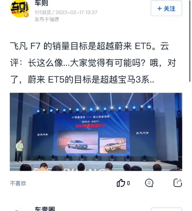 飞凡F7居然直接正面叫板蔚来ET5,这飞凡可是真的会呀。要知道,蔚来ET5比它早发布了一年多,而且蔚来ET5可是对标宝马3系的,而且还做到了。所以,飞凡F7现在正面叫板蔚来ET5的话,压力很大哦!不过飞凡F7既然敢这样叫板,说明别人底气足,光从F7展出来说,内饰舒适体验上,飞凡就甩了蔚来ET5很多条街,加上飞凡F7还卷了价格,就目前情况来看,飞凡F7优势还真不少。不过作为吃瓜群众,我保持中立态度,希望你们多卷卷,这样我就能花最少的钱,买到最好的车啦!