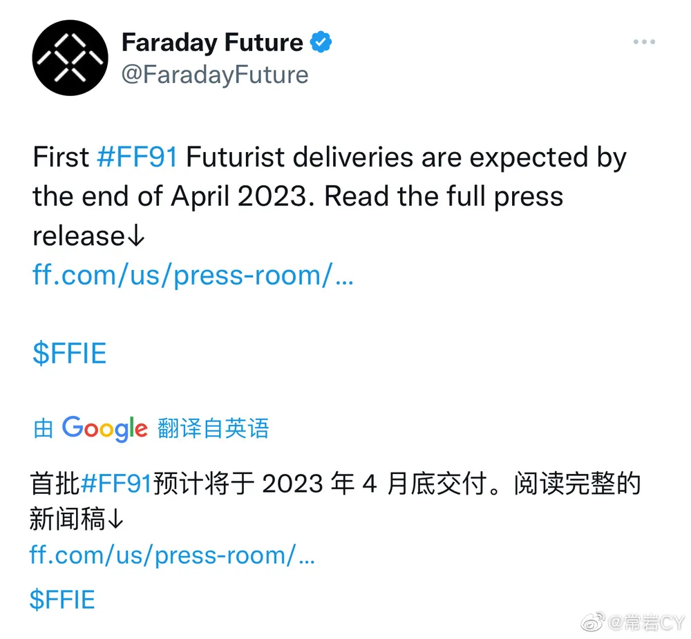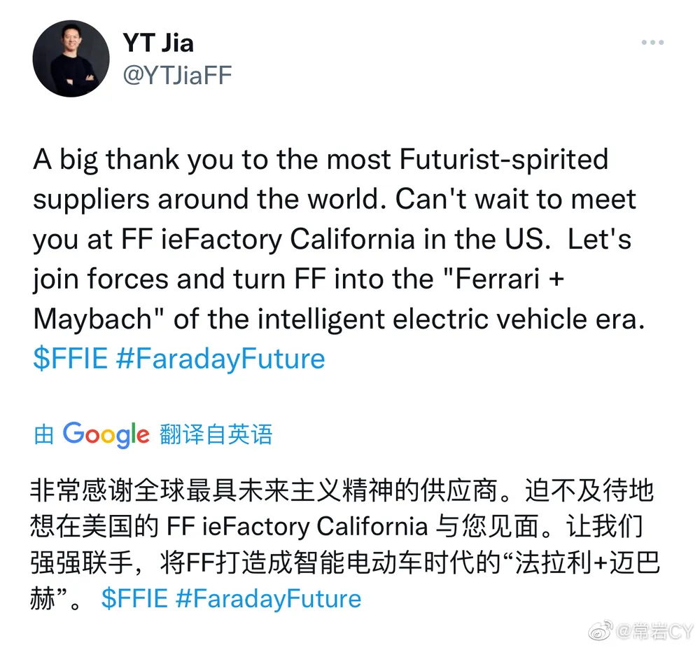 法拉第未来宣布将在4月交付首批FF91,贾跃亭转发了这个消息,说将把FF打造成电动车届的“法拉利+迈巴赫”