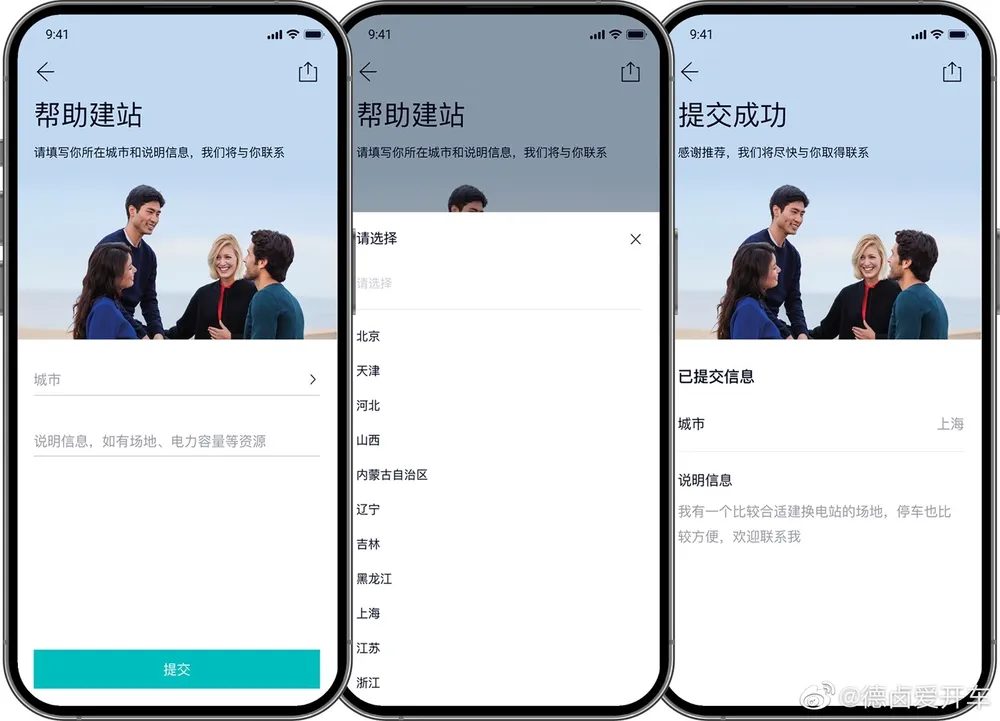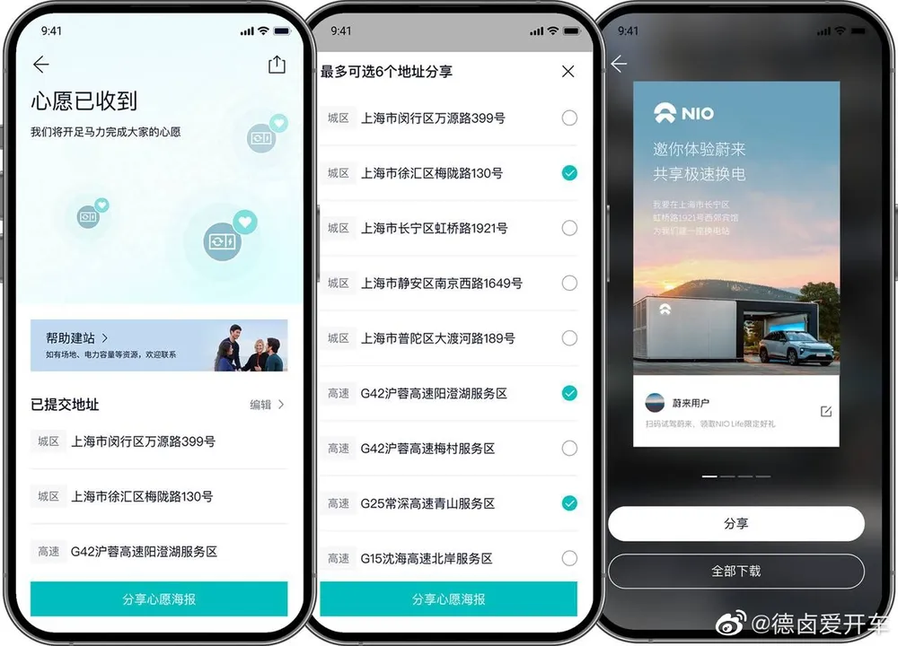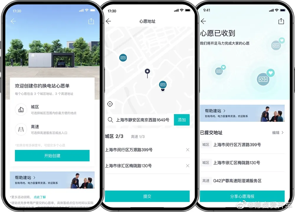 每位用户可以根据自己的需求,填写3个城区换电站和3个高速换电站的心愿地址,多车用户可多倍填写。