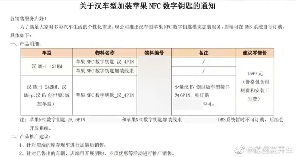 比亚迪 iPhone NFC 加装升级方案, 目前适配汉DM-i/DM-p/EV创世版, 该项目的官方建议价格为 1,599 元。