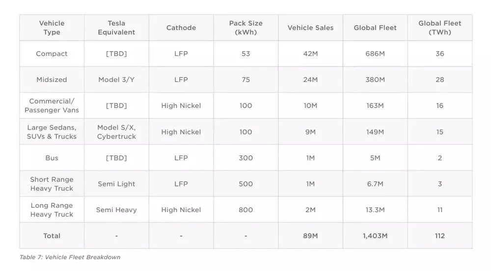特斯拉新款小型电动汽车将搭载 53kWh 磷酸铁锂电池 特斯拉当地时间 4 月 5 日发布其可持续性能源发展 “宏图计划” 第三篇章(Master Plan Part 3)的完整文件,透露了新款小型电动汽车的信息。 IT 之家在文件第 22 页中发现,特斯拉公布了旗下电动汽车战略表: 一款待定(TBD)的小型电动汽车将配备 53kWh 磷酸铁锂(LFP)电池,目标销量 4200 万辆。 中型汽车(如特斯拉 Model 3 / Y)将配备 75kWh 磷酸铁锂电池,目标销量 2400 万辆。 大型三厢车、SUV 和货车(如特斯拉 Model S / X 及 Cybertruck 电动皮卡)将配备 100kWh 高镍电池,目标销量 900 万辆。 长续航重卡(如特斯拉 Semi 重型)将配备 800kWh 高镍电池,目标销量 200 万辆。 表中还提到了特斯拉商业 / 货运汽车、特斯拉公共汽车等,分别配备 100kWh 高镍电池和 300kWh 磷酸铁锂电池。