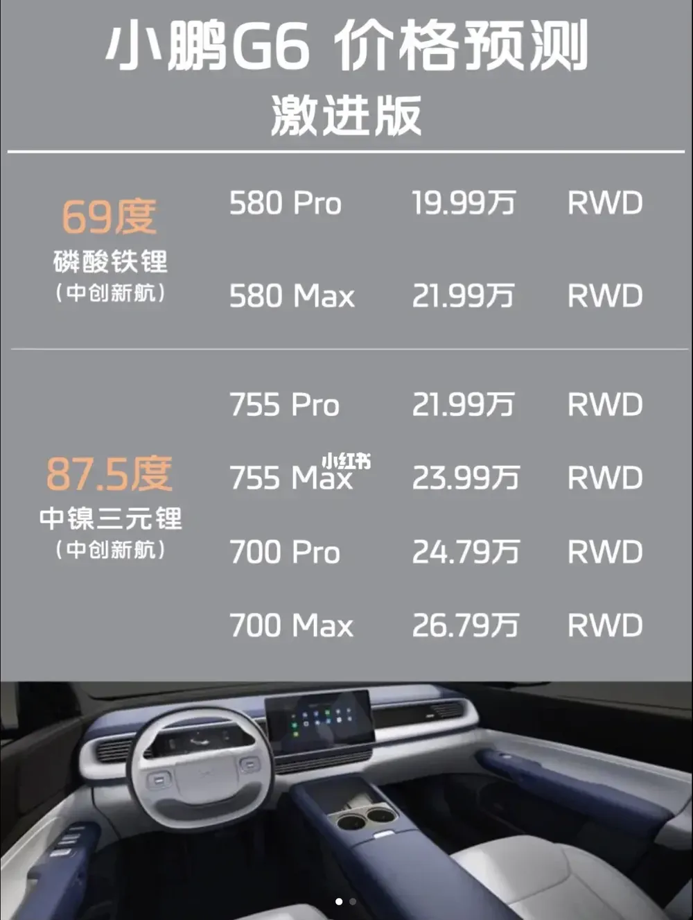小红书上出现了两张小鹏 G6 的价格预测图。 如果真的是激进版的价格,大家会考虑吗?反正两个版本我都会冲。