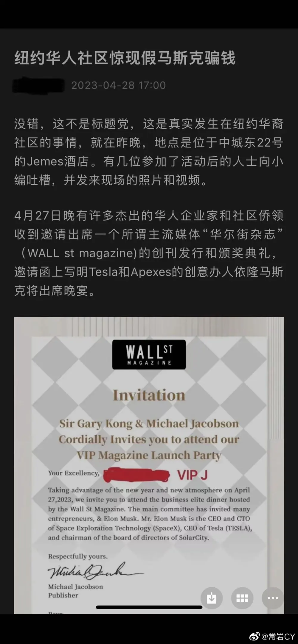 这是我今天看到的最搞笑的新闻了:《纽约华人社区惊现假马斯克骗钱》。 真的,你还不如骗人说马斯克来不了了……你这假的确实太假了……