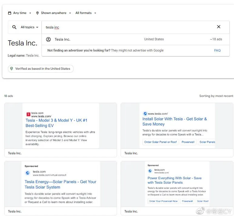 重磅,特斯拉开始正式做商业广告了。 特斯拉已经正式开始在谷歌上投放广告。通过谷歌提供给广告商的广告透明度工具进行验证。 目前推出了18个广告。之后可能会有更多的广告出现。 很期待初期的内容会是啥样。