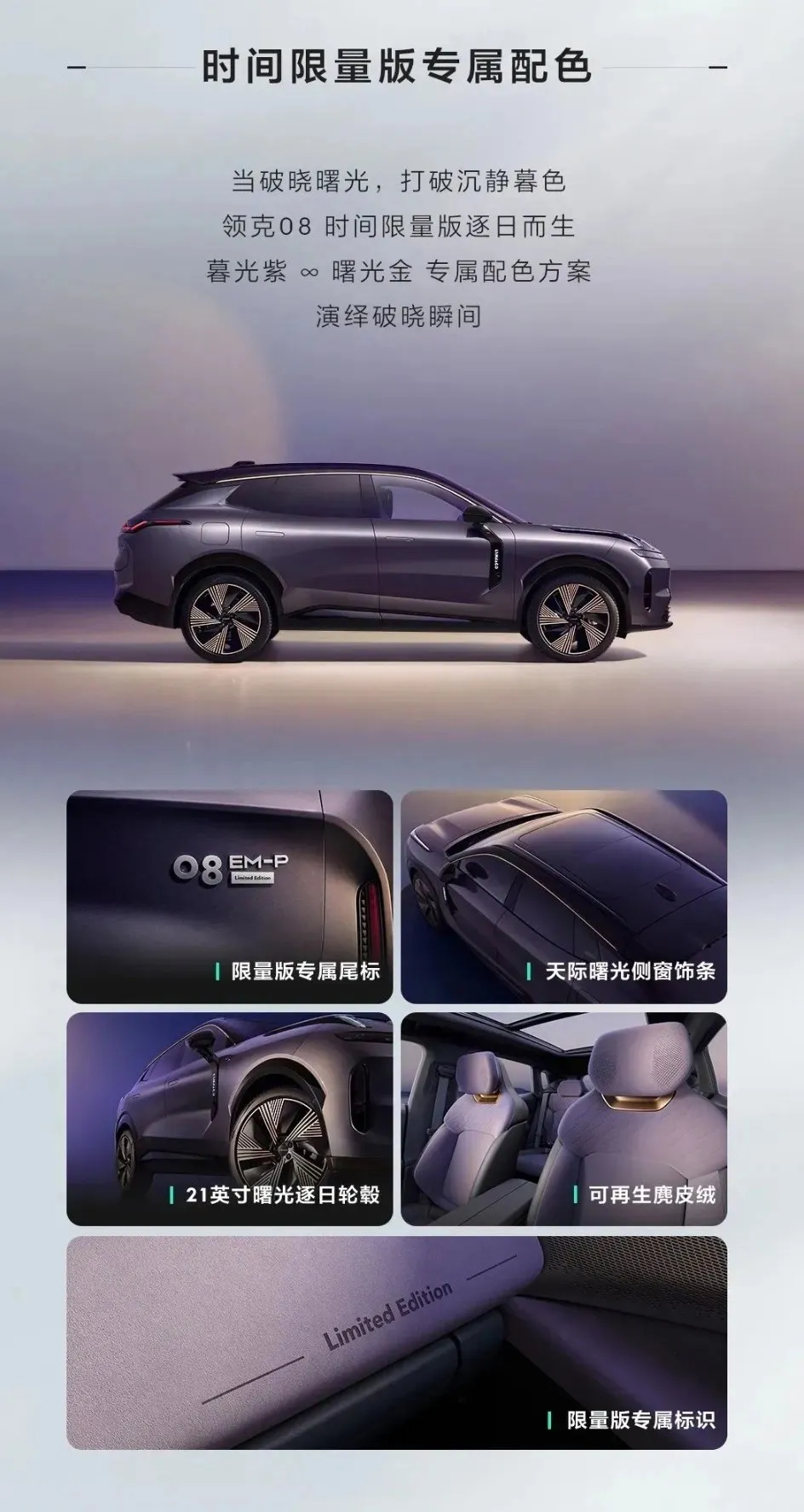 时间限量版拥有专属暮光紫 ∞ 曙光金配色,搭载专属尾标、21 英寸曙光逐日轮毂等。