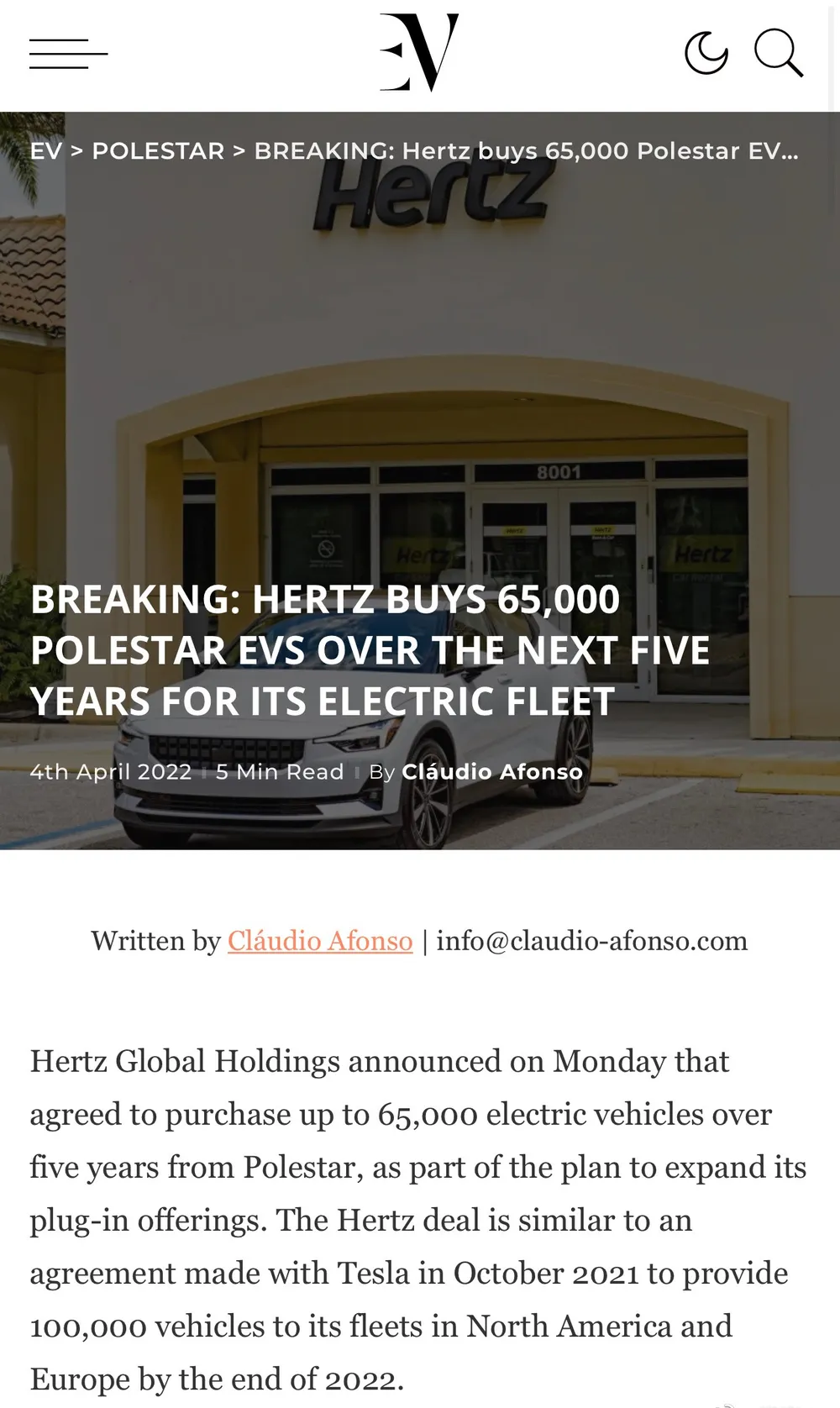 刚刚买了十几万辆特斯拉的Hertz宣布,将在未来5年内购买65000辆极星电动车。
