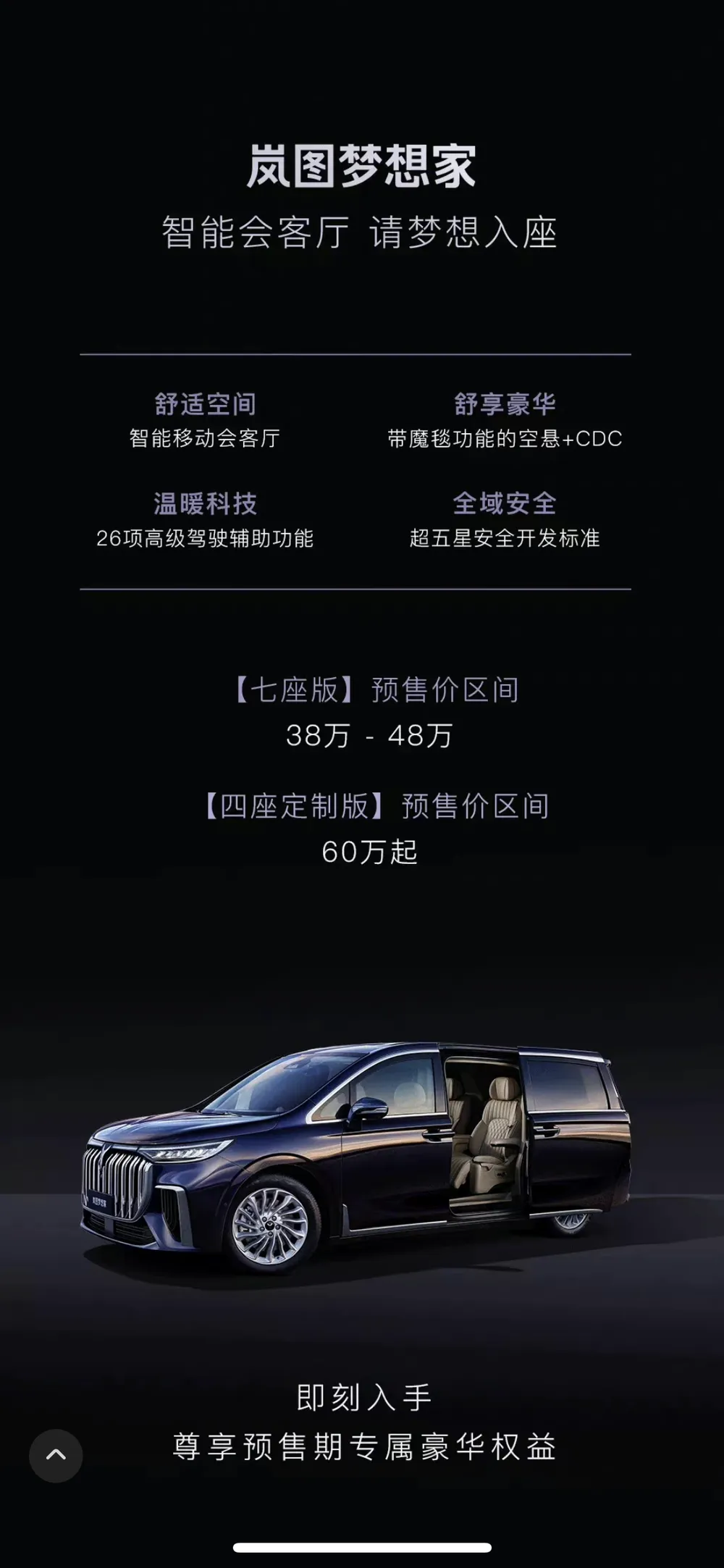 岚图梦想家上市了,7 座版售价 38—48 万,4 座版售价 60 万起。