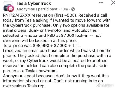 坊间传闻称,三电机版Cybertruck将定价98,990 美元+7000美元的 FSD 费用。 2019 年开放预订时,特斯拉 Cybertruck Tri-Motor 的定价为 69,990 美元。 如果消息是真的话,意味着车价增加了 29,000 美元。